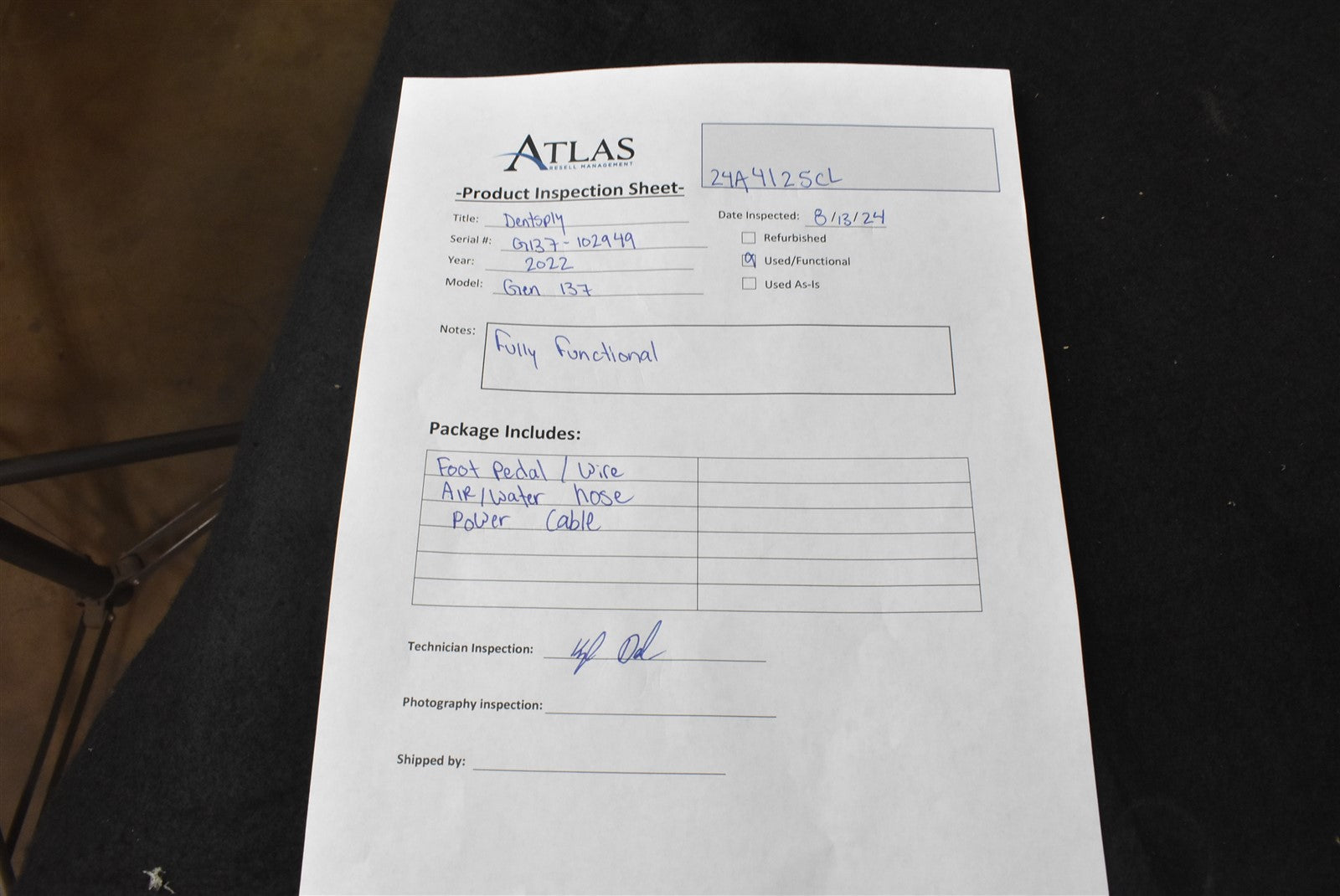 Attached unit to all required attachments for function. Including water. compressed air, foot pedal, and 120V power source. Unit does not include prophy tip, used one Atlas has in house. Proceeded to power unit on and engage foot pedal. Upon engaging foot pedal, unit responded dispensing water out tip in a adequate mist. Knob to adjust prophy settings as well as water rotates with no issues and does not over rotate. Handpiece water adjustment also controls water by increasing/decreasing as intended. Unit is in good cosmetic condition with MINOR wear and tear from prior use, as well as MINOR scuffs from prior use. Unit includes everything required for function but DOES NOT include prophy handpiece TIP!. UNIT FULLY FUNCTIONAL