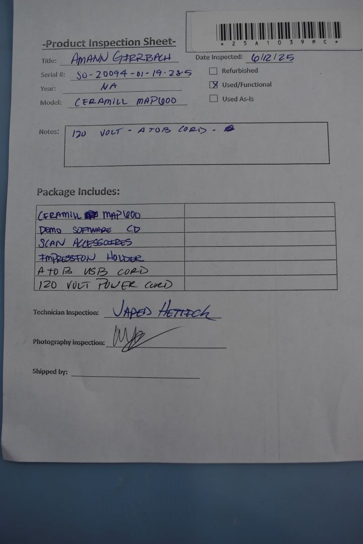 Atlas Resell Management has more experience testing and shipping CEREC and other CAD/CAM units than anyone else on eBay. Just check out the wide selection of CAD/CAM units in our store.We're proud to be the most trusted source for quality used CAD/CAM units in the pre-owned dental equipment market. Your purchase will NOT include:This product is pre-owned and may not include the same accessories as a new, unused unit. - other accessories not shown or listed here.The Ceramill Map 600,Calibration Check – Before scanning, the scanner undergoes an automatic calibration to ensure accuracy. This step aligns the Ultra HD industrial camera and Blue Light technology for optimal scanning precision.The scanner performs test scans on standard reference objects to verify its 4 μm accuracy. This ensures that the scanner is correctly capturing details.Software demo accessoires uncluded- The unit has been cleaned and disinfected. Inspection Result: - Ready for Resale.