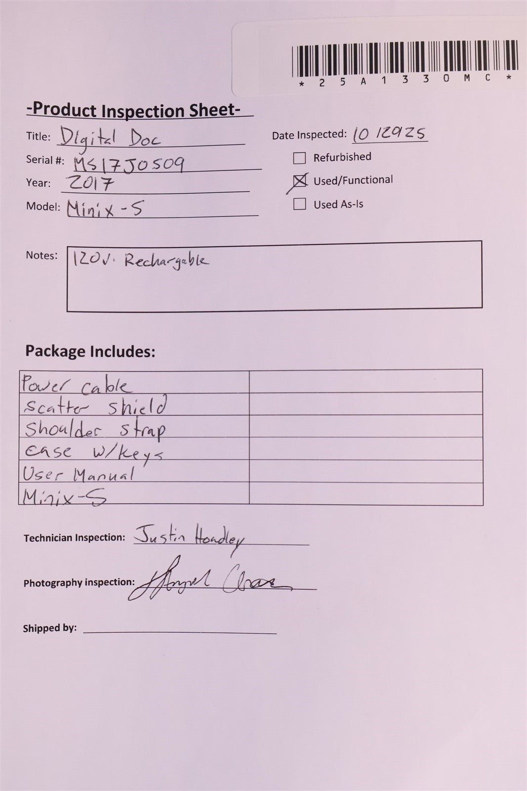 Your purchase will NOT include:This product is pre-owned and may not include the same accessories as a new, unused unit. - other accessories not shown or listed here.The unit was successfully powered on and underwent a comprehensive functionality check. Battery charging capability was verified, and both the display and control interface responded appropriately. A test X-ray exposure was performed, confirming operational integrity across all core components. The system is fully functional.