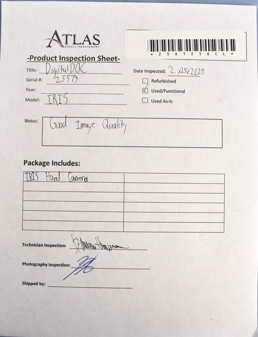 The DigitalDOC Iris was inspected for its image quality and light functionality. The image it generated was without flaw. The light turns on without issue and is an appropriate brightness. Inspection Result: Passed - Ready for Resale