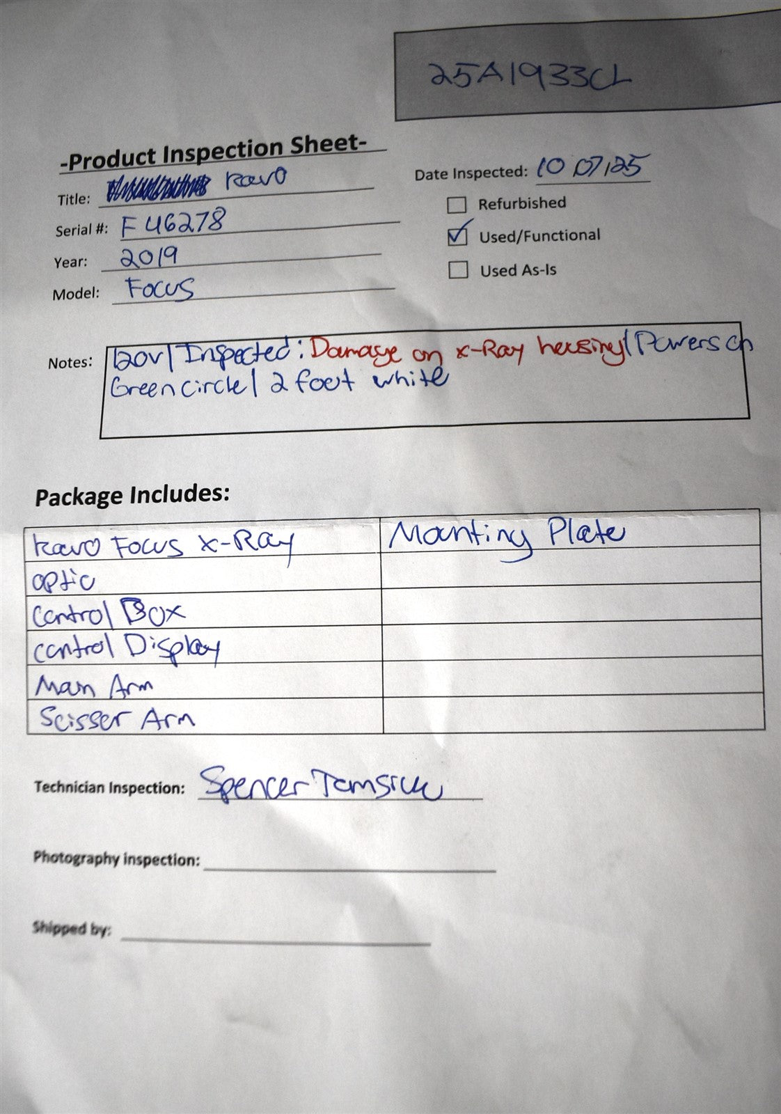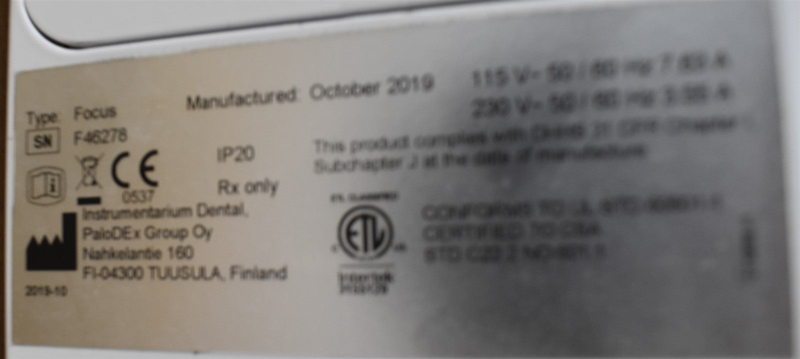 Your purchase will NOT include: This product is pre-owned and may not include the same accessories as a new, unused unit. - other accessories not shown or listed here.The KaVo Focus X-ray was wired to power and connected to the control panel. Test exposures were performed at the lowest and highest available power settings. During testing, a green circle was observed on the phosphor (“phosphorus”) plate.