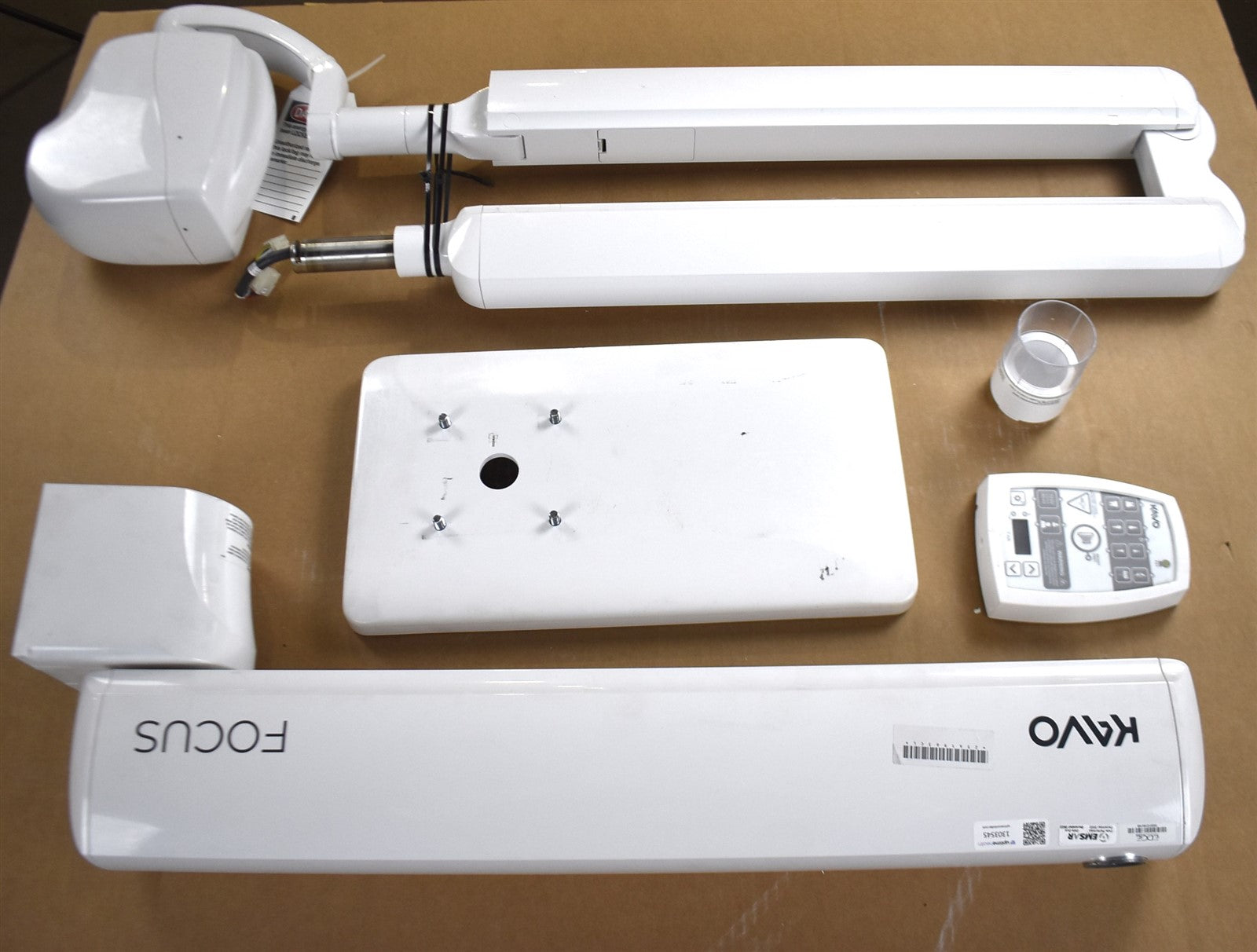 KaVo Focus X-ray, Control Display, X-ray Optics, Horizontal Arm, Scissor Arm, and Control Box.