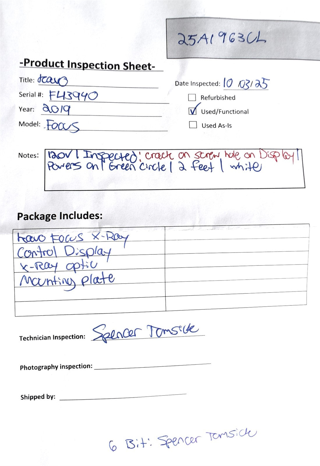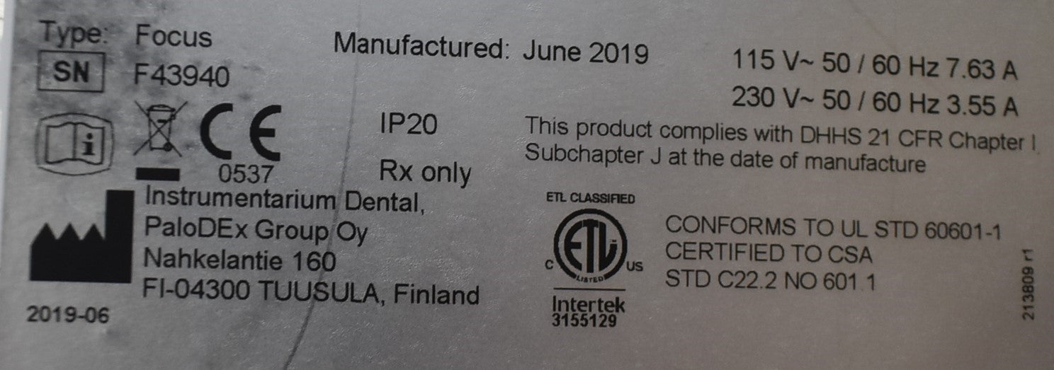 Your purchase will NOT include: This product is pre-owned and may not include the same accessories as a new, unused unit. - other accessories not shown or listed here.The KaVo Focus X-ray was wired to power and connected to the control panel. Test exposures were performed at the lowest and highest available power settings. During testing, a green circle was observed on the phosphor (“phosphorus”) plate.