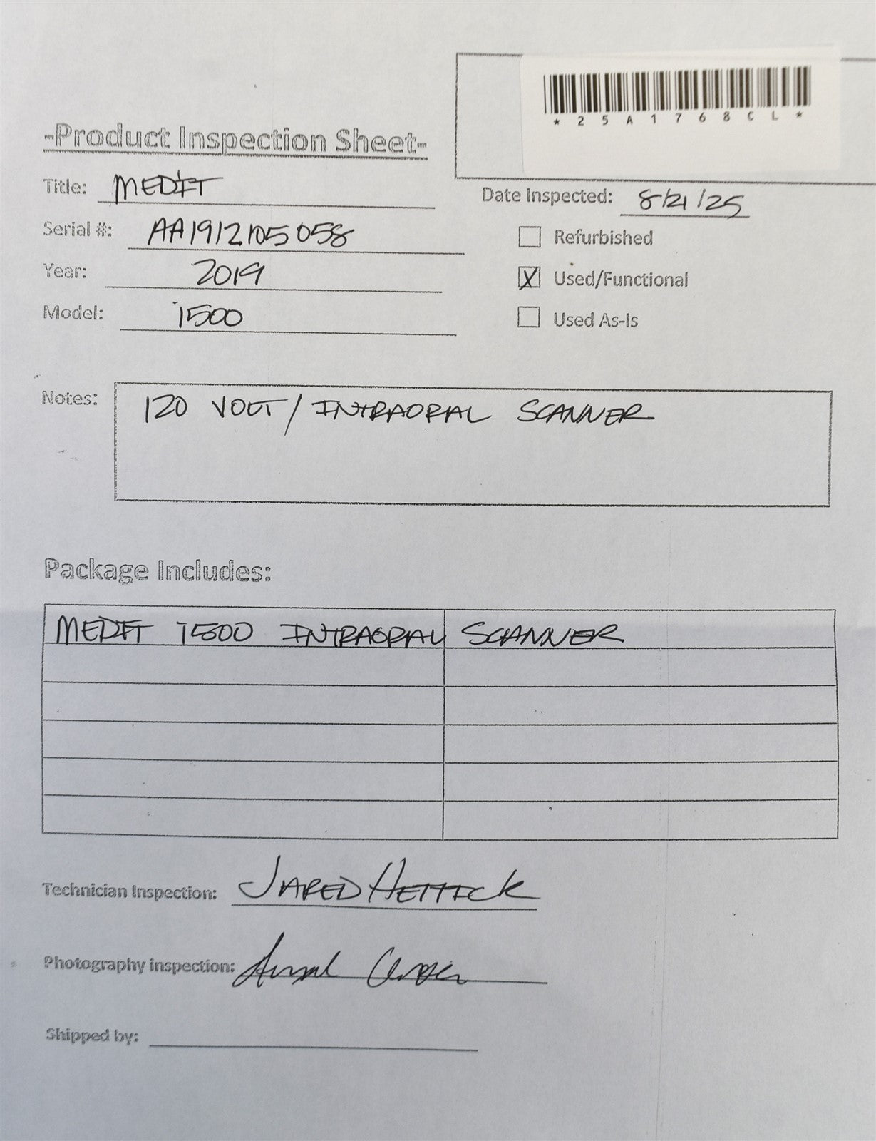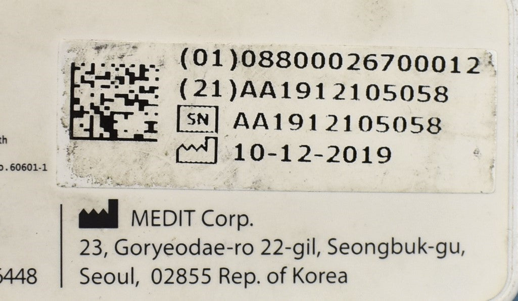 Medit i500 Intraoral Scanner was powered on (USB) , Blue light came on. Fan is running. Inspection Result: - Ready for Resale.