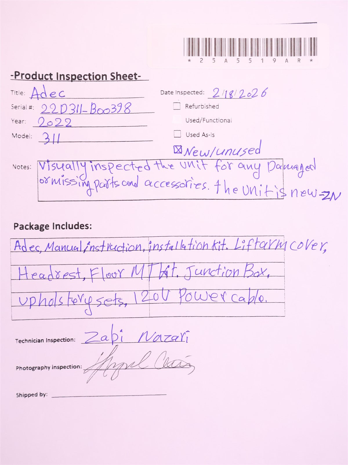 Visually inspected the unit for any damaged or missing parts and accessories. The unit is new/ Unused-ZN
