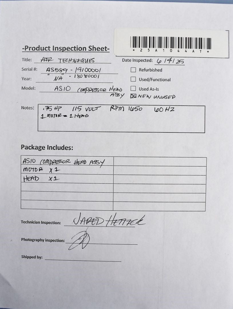 Your purchase will NOT include: - other accessories not shown or listed here.New in box Air techniques compressor head Assy, opened box and checked for all contents. assembly kit included. Ready for resale.