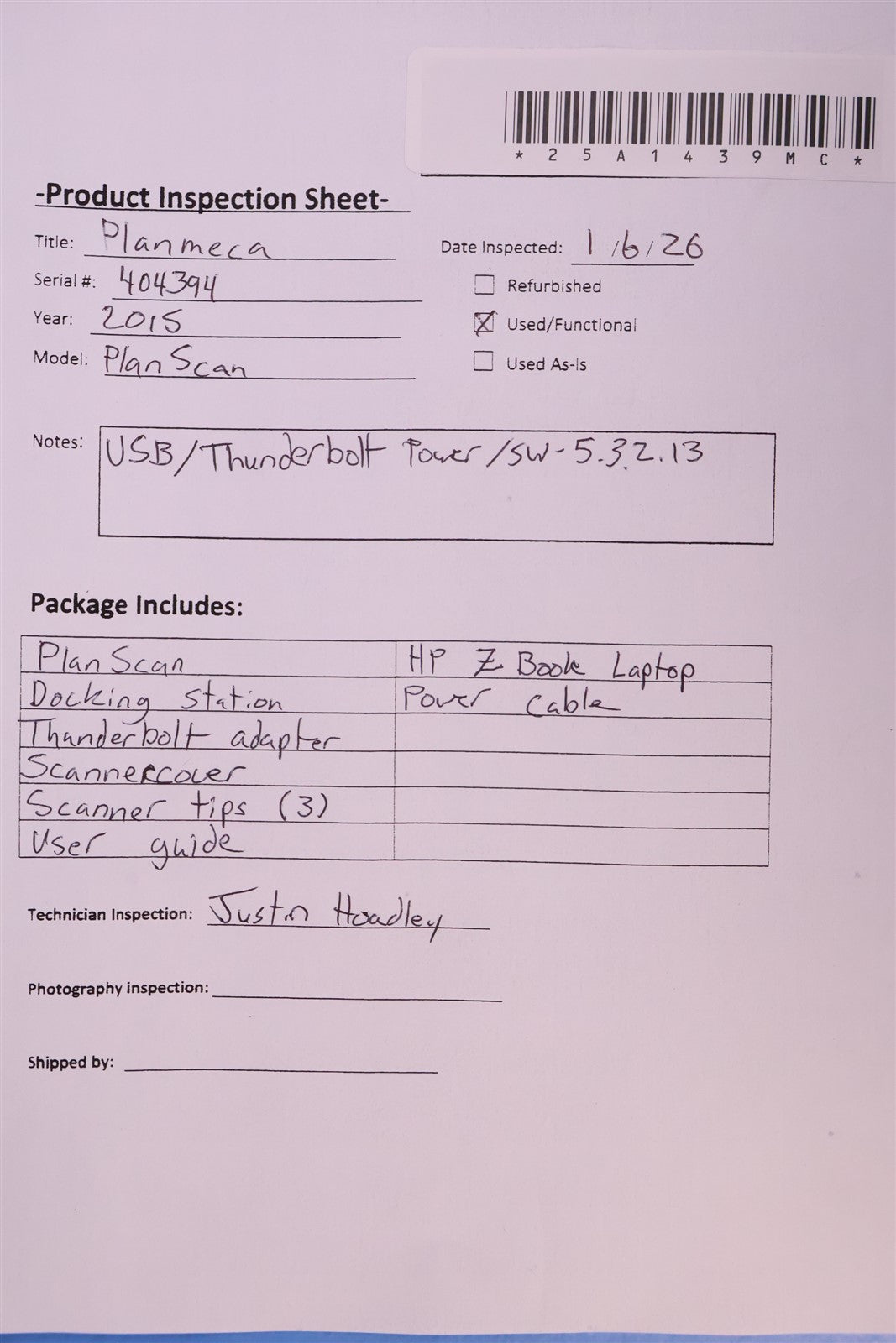 The unit was powered on and underwent a full visual and operational inspection. The scanner activation button was tested and confirmed to function properly. A complete test scan was performed without errors, demonstrating accurate acquisition and stable performance. Based on these assessments, the unit is operating normally and is fully functional.