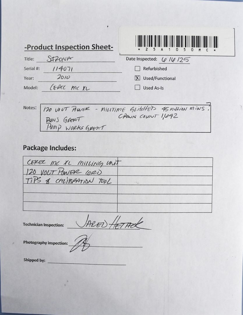 Sirona Cerec MC XL milling unit Was inspected for damage and defects, . Powered on unit for functional test. Ran STEPPER test: MOVING test Calibration tested .Mouse and keyboard connected,all lights and buttons were fully functional.120volt. Inspection Result: - Ready for Resale.