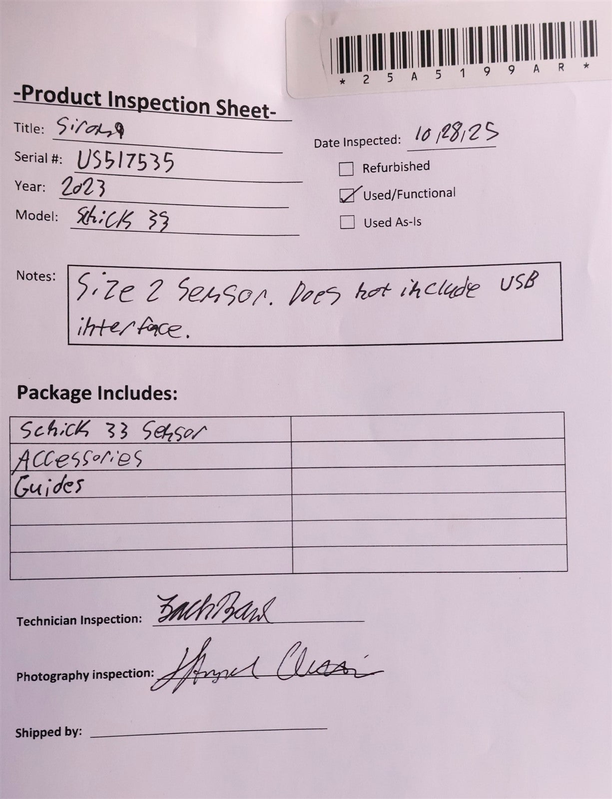 Your purchase will NOT include:USB InterfaceThis product is pre-owned and may not include the same accessories as a new, unused unit. - other accessories not shown or listed here.Attention BuyerFinding and/or installing imaging software and drivers for digital dental equipment is the buyer's responsibility.Apteryx is a company that sells easy-to-use imaging software that is compatible with most of the digital equipment in our store. Click here for more information about Apteryx and their pricing options.Click here for a list of equipment that is compatible with Apteryx imaging software.This item has undergone a thorough visual inspection and functional testing to check for any and all defects. The unit has been confirmed to be in complete working condition, with no issues or malfunctions detected.
